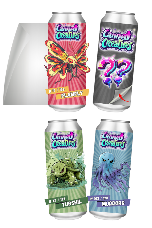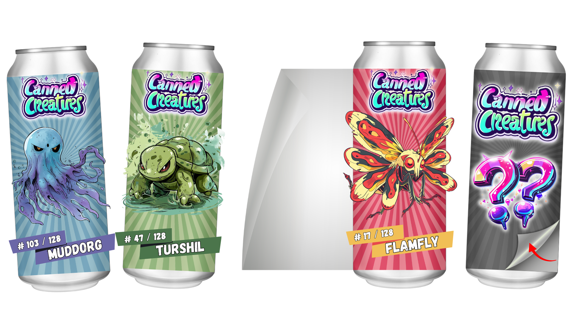 Collect, reveal, and power up. Each can hides one of 128 mystical creatures.